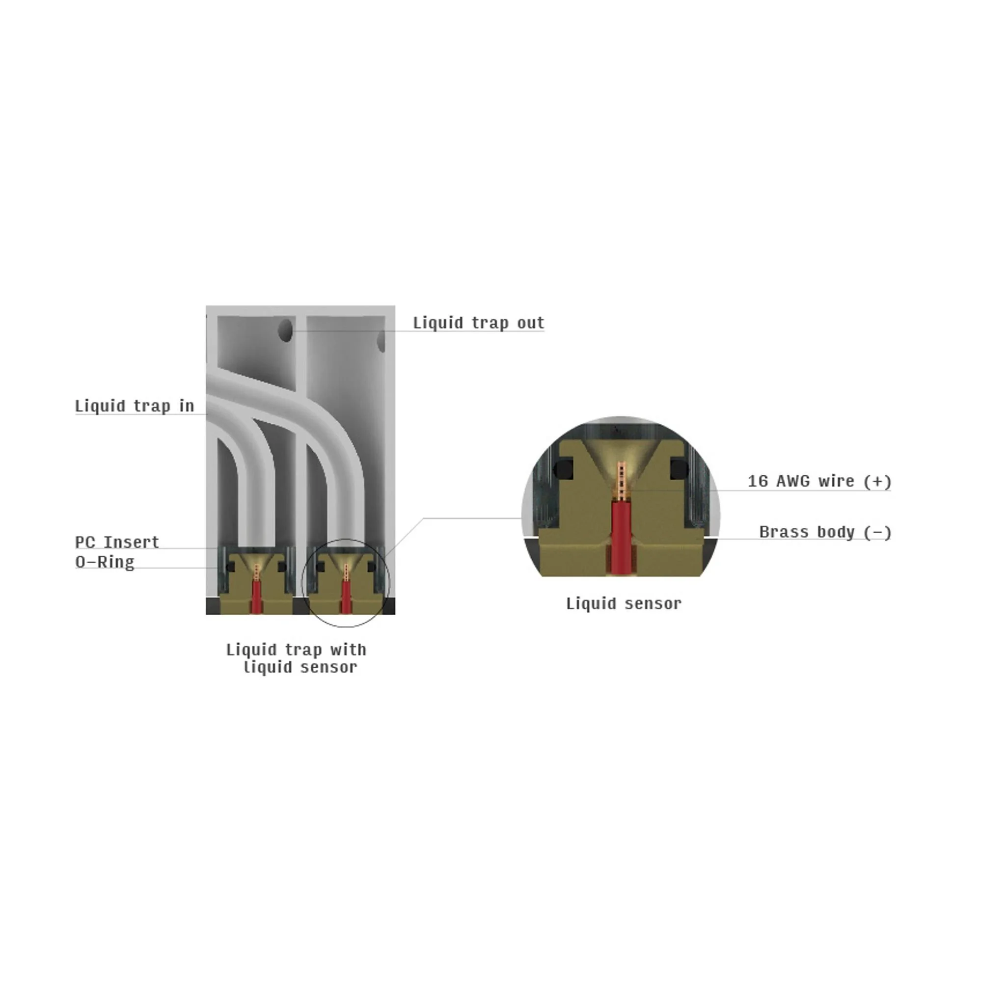The sensor contained both a capacitor to detect liquid and a funnel to catch liquid. When no liquid was encountered, the sensor maintained a voltage through two non contact concentric conductive objects (brass body and 16 AWG copper wire). The introduction of liquid would change the voltage. The sensor was placed at the bottom of the fluid trap, a location that every drop of liquid would necessary need to pass through if it were to flow back to the workstation.