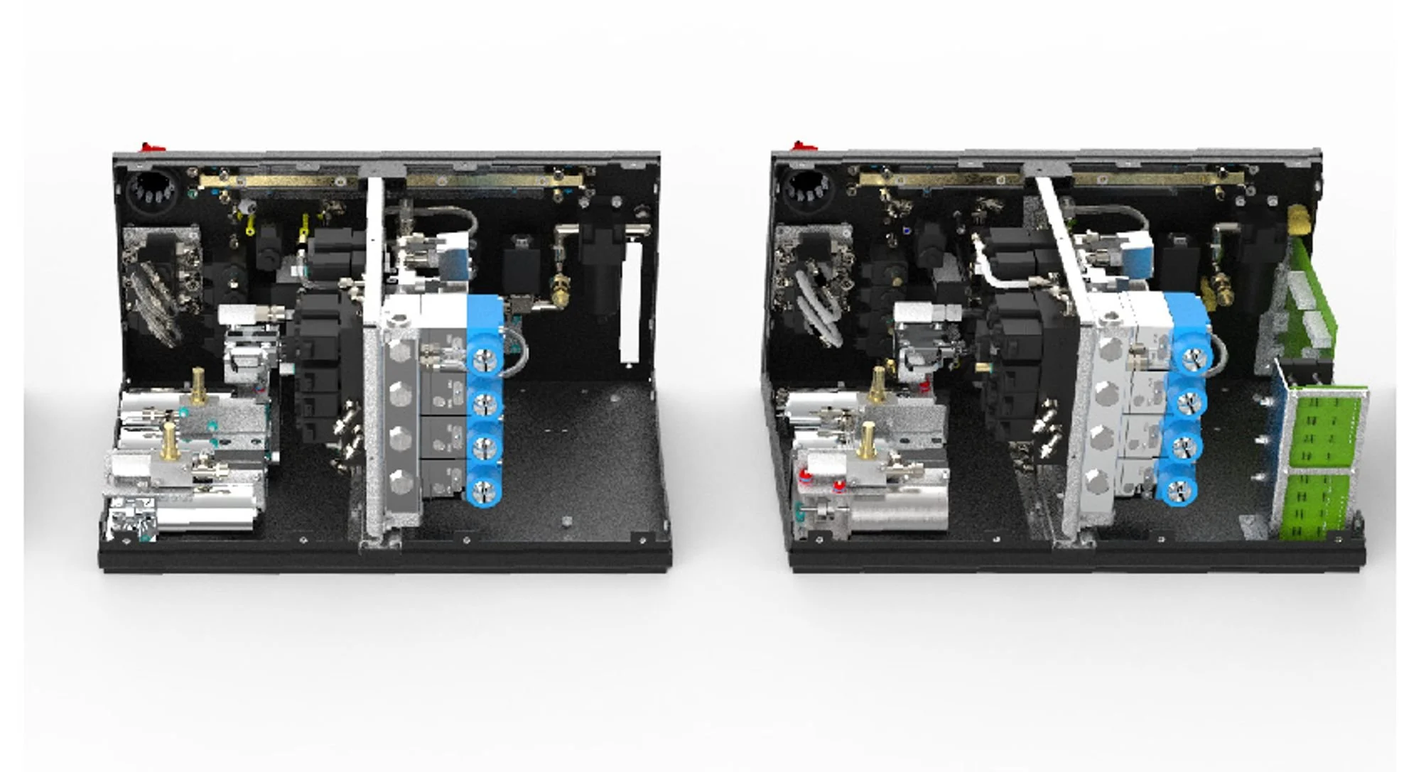 All the pneumatic critical components were packed into an anodized aluminum sheet metal box that could be easily connected and disconnected to the workstation. Thus, in the event of a failure, a user would need to open the side service door, remove the pneumatic unit, and slide in a new one. A new unit could be obtained by order from the company.